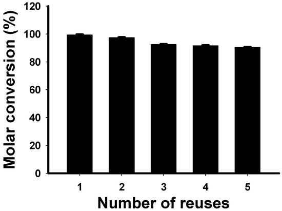 To examine the enzyme reusability, the ability of reused immobilized lipase for 2-EF synthesis was investigated under optimum conditions (Figure 6). After reaction, the mixture was filtered through a 0.45 μm membrane. The immobilized lipase was then recovered from the membrane, washed three times with fresh reaction media and dried before reuse in the next batch. After the immobilized lipase was reused five times, the molar conversion of 2-EF still remained at about 90.4%. This result showed that the immobilized lipase remained stable through long-term 2-EF exposure. Thus, the result demonstrated that the lipase could be effectively applied for 2-EF synthesis in the reduced pressure evaporation system and that the stability was high enough to permit reuse.