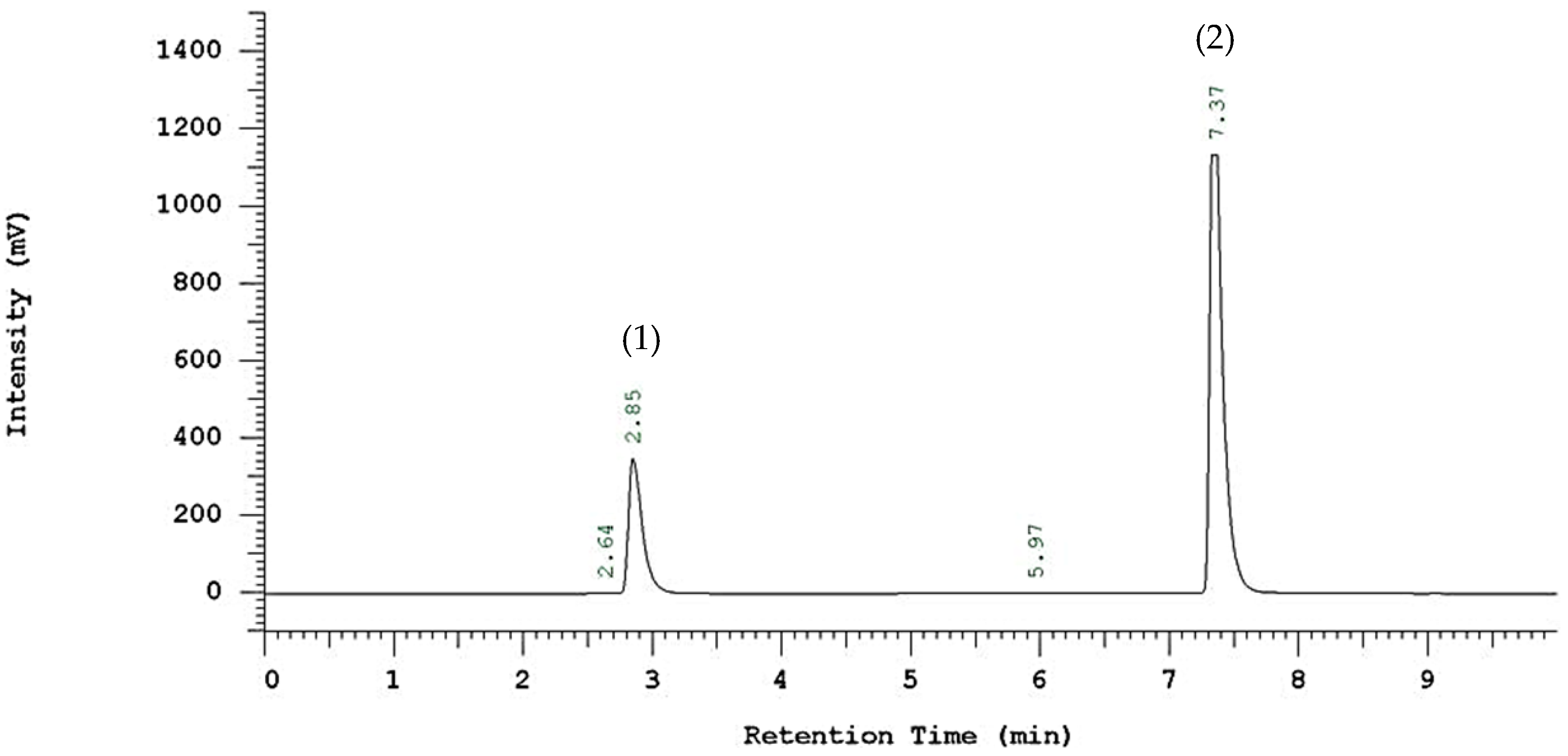 HPLC chromatogram of ferulic acid and its ester form. (1) ferulic acid; (2) 2-ethylhexyl ferulate.