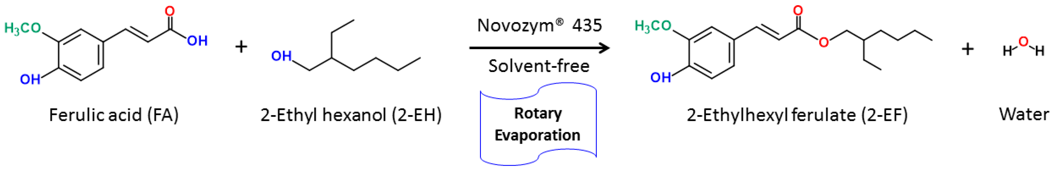 FA was dissolved in 2-ethylhexanol (1 mL) to the concentration of 0.05 M in the fingernails emissions glass flask that contained Novozym®435 of a rotary evaporator (EYELA N-1100, Tokyo Rikakikai Co., Ltd., Bohemia, NY, USA), which operated at 80 rpm and 560 torr under different experimental conditions. The esterification of FA with 2-EF catalyzed by Novozym®435 is represented in Scheme 1.