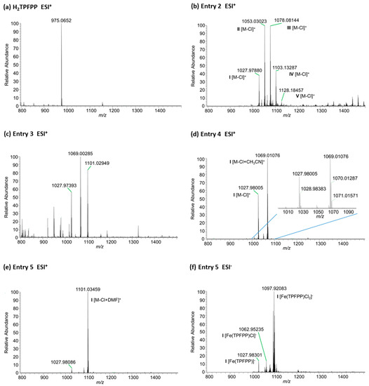 High Resolution ESI mass spectra analysis of H2TPFPP (a) and of iron complexes obtained under the experimental conditions described in Table 1, Entry 2 (b); Entry 3 (c); Entry 4 (d); Entry 5 (e,f).