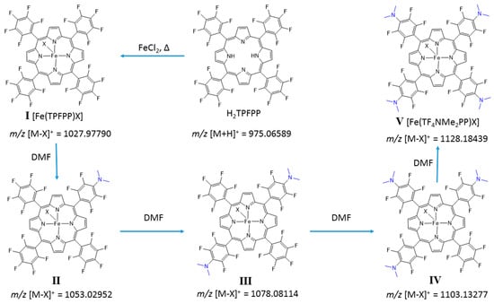 Compound V is the main complex obtained using an experimental procedure based on the Adler method. This consists of refluxing a solution of H2TPFPP in DMF and pyridine (10:1 v/v) using conventional heating and adding 10 molar equivalents of FeCl2. The reaction is monitored by TLC and addition of the same amounts of iron salt and pyridine continued until full conversion of the H2TPFPP was achieved (Table 1, Entry 1). The resulting product was analyzed by mass spectrometry (Supplementary Materials, Figure S2). The most intense peak m/z 1128.2 corresponded to the ion [M − Cl]+ from the tetra-substituted derivative [Fe(TF4NMe2PP)Cl] (V).