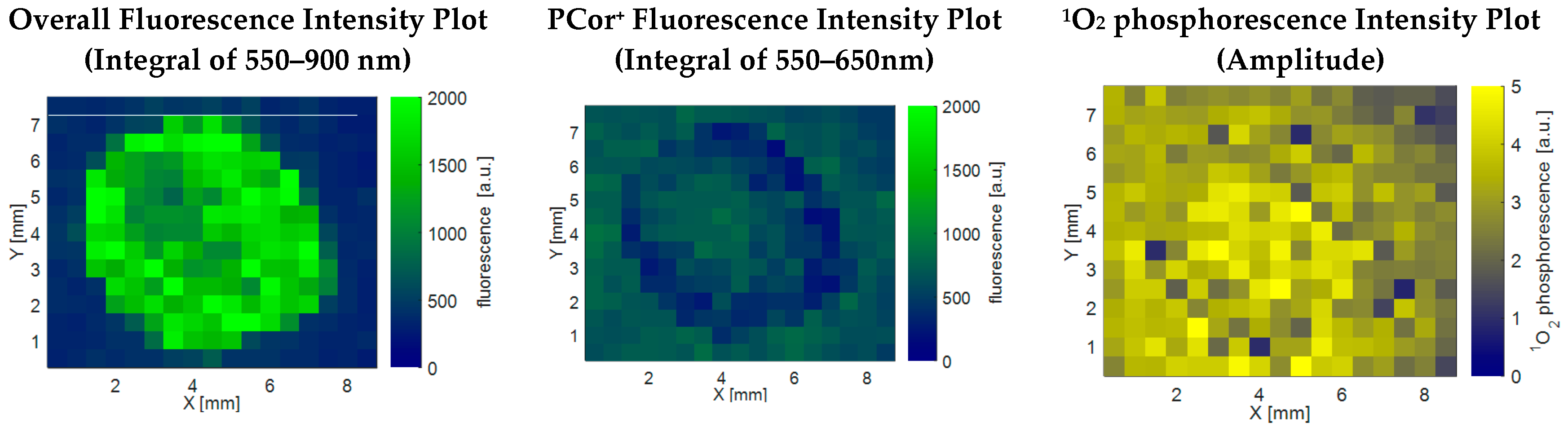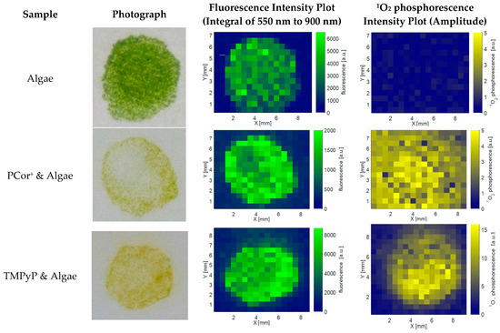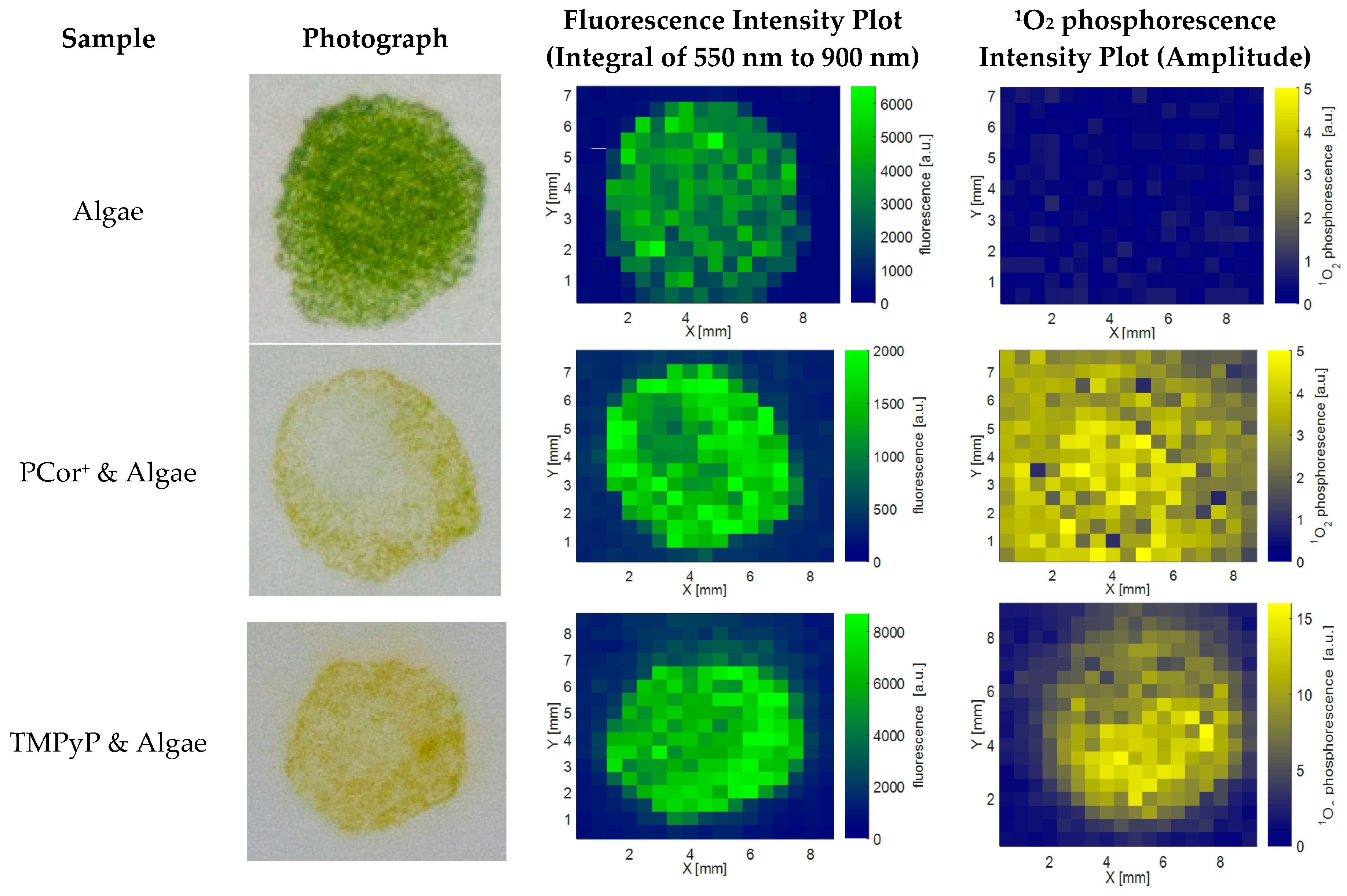 Figure 1 shows photographs, spatial fluorescence and 1O2 phosphorescence plots of the algae reference, the PCor+-algae, and the TMPyP-algae samples after one day of incubation (on day 2). Photographs of the samples are presented in the first column, the spatial distribution of the fluorescence in the second and the spatial distribution of the 1O2 phosphorescence in the third column. The photographs illustrate the sample geometry and the inhomogeneity due to the sample preparation technique. The fluorescence intensity in the plot equates the integral over the spectral range of 550–900 nm. The 1O2 phosphorescence intensity shown in Figure 1 equates the fitted amplitude.