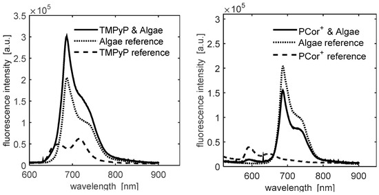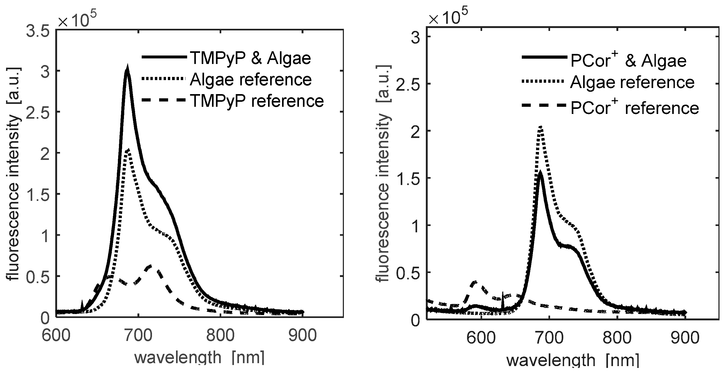 Comparison of fluorescence spectra of PCor+ and TMPyP with algae to photosensitizer and algae reference (fluorescence intensity not corrected for different sample geometry).