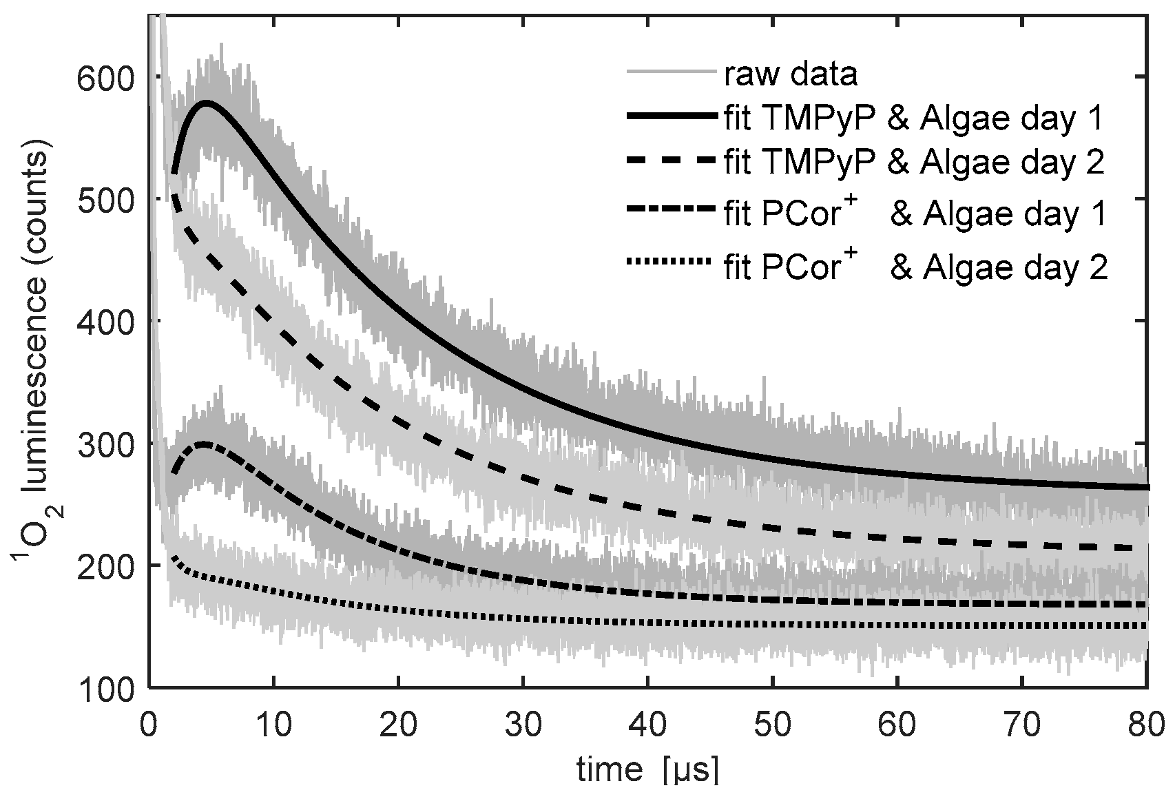 Moreover, measurements at 1210 nm show a weak NIR signal for all TMPyP samples, in contrast to the algae references and all PCor+ samples where no signal was observed. The signal decreases exponentially over several μs, corresponding to one of the additional exponential terms of the 1O2 kinetics. Due to the kinetics and the design of both, the laser and the 1O2 detection system, a measurement artefact is very unlikely. Since the signal is not significant in comparison to the here presented signals, it is not shown here.