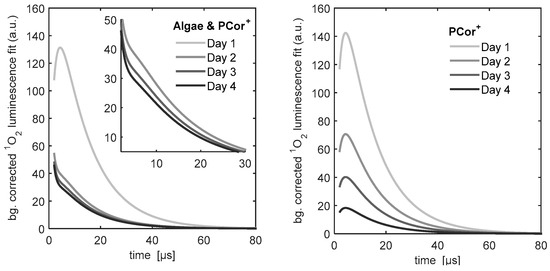 Figure 5 shows the 1O2 kinetics of the PCor+ reference sample and the PCor+-algae sample. The 1O2 kinetics of the reference sample could be described by the unmodified biexponential model, i.e., without any extension. For the kinetics of the 1O2 kinetics of the PCor+-algae sample, the biexponential model had to be extended by one additional simple exponential term.