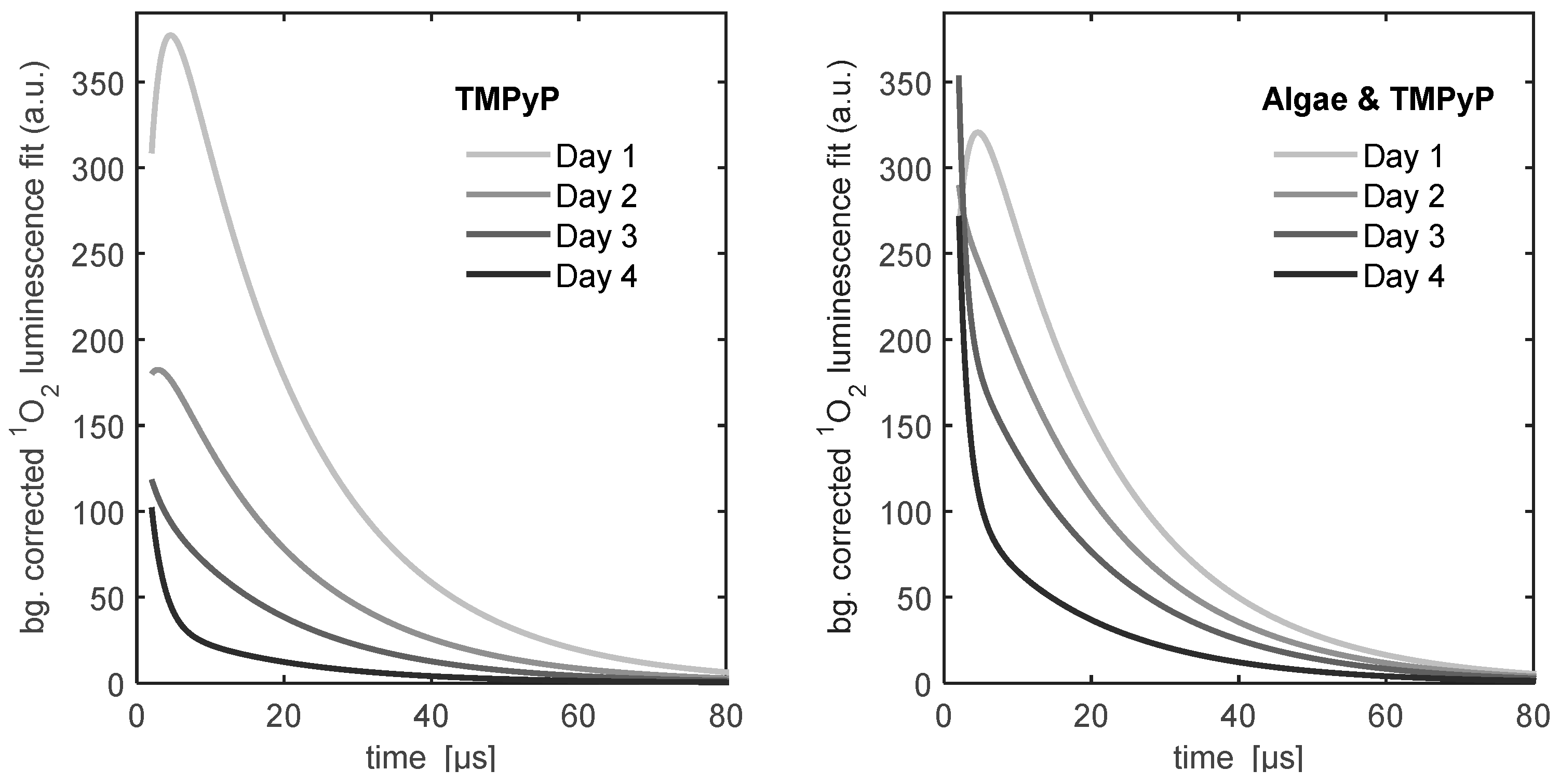 Figure 4 shows the raw data and the fitted model functions for the first two days, obtained in the aforementioned fashion. Even though the detailed analysis of the kinetics parameters is not the subject of this article, which presents a feasibility study, changes of the 1O2 kinetics during the first two days of measurement and differences in the 1O2 kinetics between the two photosensitizers as well as references and algae samples are clearly observed.