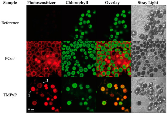 Localisation of the photosensitizer in Chlorella fusca var. vacuolata after three days of incubation. PCor+ appears to locate outside the algae cells while TMPyP appears to accumulate inside the algae cells.