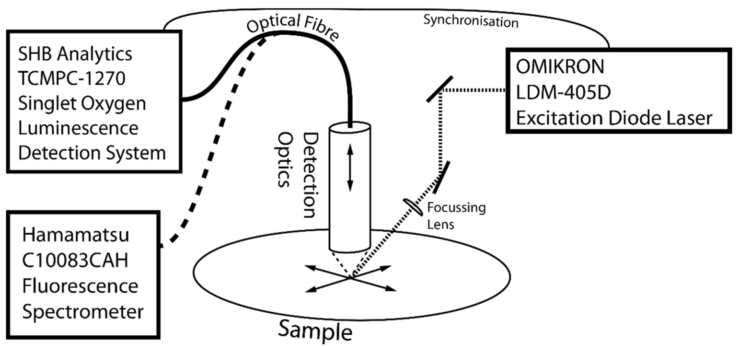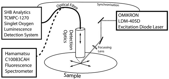 An experimental setup was constructed for obtaining reproducible scans of luminescence on sample surfaces (Figure 8). It consists of an LDM-405D excitation laser (Omikron-Laserage, Rodgau-Dudenhofen, Germany) a cross table allowing one to scan a sample in the X and Y directions, a detection optics system coupling the excited luminescence into a fibre, movable in the Z direction, a TCMP-1270 Singlet Oxygen Luminescence Detection System by SHB Analytics (Berlin, Germany) and a C10083CAH Fluorescence Spectrometer by Hamamatsu (Hamamatsu, Shizuoka, Japan).