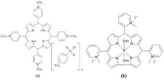 5,10,15,20-Tetrakis(1-methylpyridinium-4-yl)porphyrin tetra(p-toluenesulfonate) (TMPyP) and 5,10,15-tris-(1-methylpyridinium-2-yl)corrolato-(trans-dihydroxo)phosphorus(V) (PCor+), the corrole-based photosensitizer reported in [17,25], were used as photosensitizers (Figure 9). TMPyP (CAS 36951-72-1) was purchased from Sigma-Aldrich Chemie GmbH (Munich, Germany), while the tricationic metallocorrole PCor+ was synthesized according to [17].