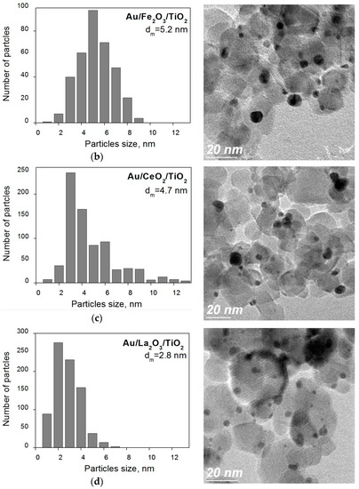 TEM images of Au/TiO2 (a) and Au/MxOy/TiO2 (MxOy = La2O3, CeO2 or Fe2O3) (b–d) catalysts pretreated in H2 atmosphere at 300 °C.