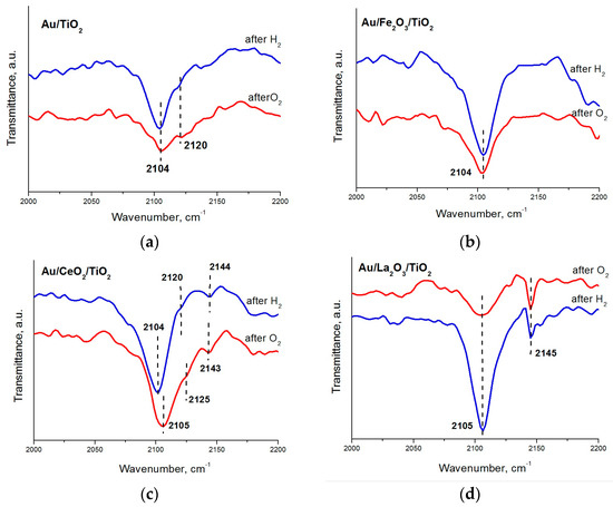 To assess the effects of pretreatment atmosphere on the electronic state of the gold, IR spectra were recorded for the samples reduced and then oxidized at 300 °C for 1 h. Figure 3 shows the IR spectra of CO adsorbed on Au/TiO2 and Au/MxOy/TiO2 (where MxOy = La2O3, CeO2 or Fe2O3) catalysts. Regardless the pretreatment conditions, one absorption band at 2104–2105 cm−1, attributable to the surface carbonyls of gold atoms Au0-CO, is observed for all studied samples [54]. Another absorption band at 2143–2145 cm−1, related to the complexes of the ions Au+-CO, was observed only for the Au/CeO2/TiO2 and Au/La2O3/TiO2 samples. Moreover, the intensity of this absorption bands changed slightly with the change of pretreatment atmosphere (H2 and O2). This band corresponding to carbonyl complexes of Au+-CO is absent in the IR spectra of the Au/TiO2 and Au/Fe2O3/TiO2 samples. An absorption band at 2120–2125 cm−1, attributed to the carbonyls of reduced gold, is observed for Au/TiO2 and Au/CeO2/TiO2; however, its relatively high νCO wavenumber indicates that these states of gold are electron deficient (Auδ+), probably due to the influence of the support.