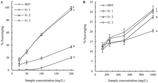 The hydroxyl radicals are the most reactive ROS generated in the body, which react with almost all components within the cell, including lipids, proteins and nucleotides [23]. Due to their high toxicity, scavenging capacity towards these radicals is widely used as an important indicator to evaluate antioxidants [25]. The effect of the pigment fractions on ·OH produced by the Fenton reaction was determined, and the results are shown in Figure 2A. All the tested samples had scavenging activities towards ·OH dose-dependently. The pigment fractions were more efficient than BHT at the tested concentrations (p < 0.05) with Fr. 2 and Fr. 3 having similar (p > 0.05) and higher activity than Fr. 1 (p < 0.05).