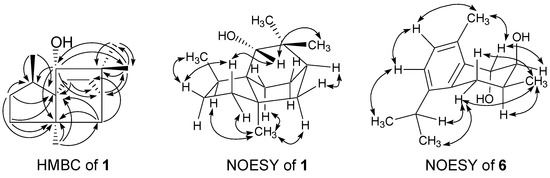 Significant HMBC (one-headed arrows) and NOESY (two-headed arrows) correlations of compounds 1 and 6.