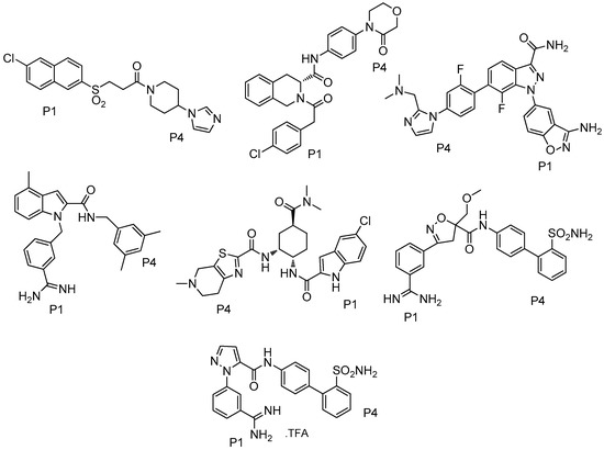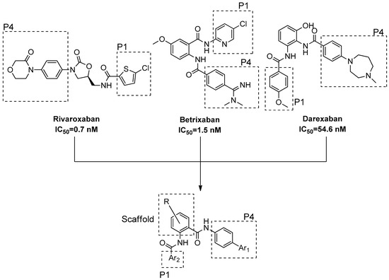 From the structures above, FXa inhibitors have three components which make up the pharmacophore: core scaffold, P1 and P4. This typical structure can help these molecules combine with FXa, P1 locates at the S1 pocket and P4 locates at the S4 pocket (Figure 2) [16]. Presented if Figure 3 here are several examples can help us understand this more clearly [17,18,19,20,21,22,23].