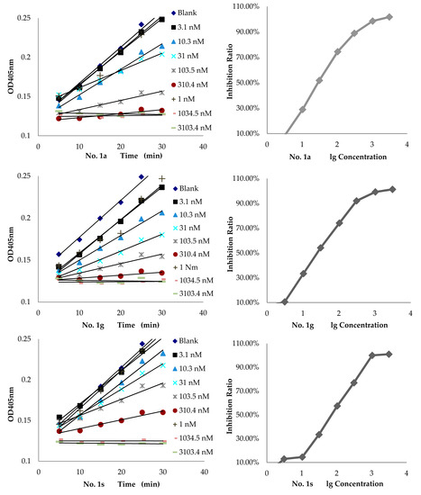All the targeted compounds were evaluated in vitro for investigating their FXa inhibitory activity, using rivaroxaban as the positive control in this assay. The assay results (Table 1) showed that several designed compounds exhibited inhibitory activity against FXa with IC50 values at the nanomole level from 951.3 to 23.0 nM. In particular compound 1g was the most promising FXa inhibitor in this series with an IC50 value of 23.0 nM. The results indicated that the compounds with a 3-methyl-substituted scaffold (1j–1l, 1v–1x) possessed relative poor inhibitory activity against FXa, with IC50 values at a micromole level no matter what kind of Ar1 and Ar2 in Table 1 they linked with. When the Ar1 group was pyridin-2(1H)-one, the compounds (1a–1l) demonstrated that the affinity with FXa ranking was electron withdrawing group substituted scaffold < electron donating group scaffold < non-substituted scaffold. Through Table 1 can also be found that using 5-chlorothiophene as P1 (Ar2) the anticoagulant activity was much better than in other cases (1a = 30.9 nM, Ki = 22.0 nM; 1g = 23.0 nM, Ki = 16.4 nM; 1s = 76.2 nM, Ki = 54.4 nM; Km = 2.4). We also show an inhibition profile figure of the most potent compounds 1a, 1g and 1s in Figure 5.