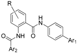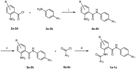 The synthetic routes used in this study are illustrated in Scheme 1. All the starting material are commercial available. As shown in Scheme 1, the acylation [26] of 3a–3b respectively with a series of o-nitrobenzoyl chloride 2a–2d provided 4a–4h, which were subsequently reduced with Zn, NH4Cl to provide the corresponding anilines 5a–5h in satisfied yields. Acylation [26] of 5a–5h respectively with 6a–6c yielded the target compounds 1a–1x.