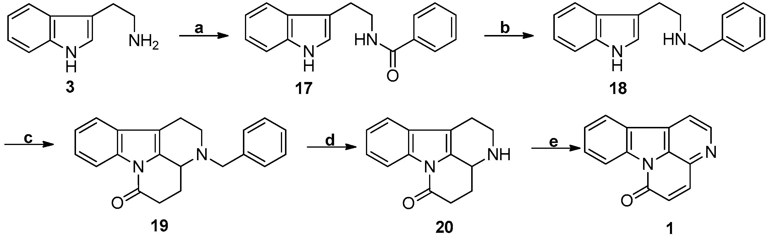 - Hagen, T.J.; Cook, J.M. Synthesis of 1-methoxycanthine-6-one. Tetrahedron Lett. 1988, 29, 2421–2424. [Google Scholar] [CrossRef]