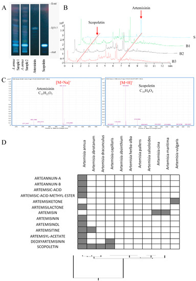 Chemoprofiling of scopoletin and artemisinin in different Artemisia species. (A) Thin layer chromatography of Artemisia annua Herba. Scopoletin and artemisinin were used as reference compounds. Shown are two commercial samples of A. annua obtained from the TCM-Hospital Bad Kötzting (Germany) of the years 1999 and 2000 (obtained with written permission of Prof. Hildebert Wagner, Ludwig-Maximilian-University Munich, Germany); (B) The TIC of the standard solution and three different batches of A. annua methanol extract. S: standard solution containing scopoletin and artemisinin; B1, B2, B3: three different batches of A. annua methanol extract; (C) Representative mass spectrum of scopoletin and artemisinin. All samples were analyzed by UHPLC-MS-TOF on an Agilent Zorbax Eclipse Plus C-18 50 mm × 2.1 mm column (particle size: 1.8 μm) at a flow rate of 0.35 mL/min. The data were acquired in the scan mode from m/z 100 to 1700 Da with 2.0 spectra/s; (D) Dendrogram obtained by hierarchical cluster analysis of phytochemical constituents of different Artemisia species. The constituents of these plants have been deposited in Dr. Duke’s Phytochemical and Ethnobotanical Databases [19,20].