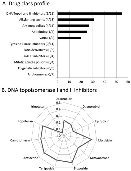 Oncobiograms for scopoletin using the NCI cell line panel. (A) Percentage of classes of established anticancer drugs, whose log10IC50 values correlate with those for scopoletin; (B) Profile of correlation values (R) DNA topoisomerase I and II inhibitors with scopoletin. The log10IC50 values are deposited at the NCI database (http://dtp.nci.nih.gov). The calculations were performed using the Pearson correlation test with p < 0.05 and R > 0.3 as threshold.