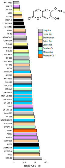 Chemical structure of scopoletin and mean values and standard deviations of log10IC50 values for scopoletin of NCI cell lines of different tumor types.