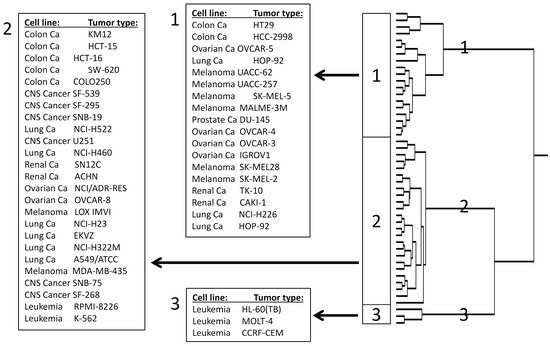 Data on cytotoxicity (log10IC50 values) and mRNA microarray data of the NCI tumor cell line panel [67] are deposited at the NCI website (http://dtp.nci.nih.gov). For hierarchical cluster analysis, objects were classified into dendrograms by calculating distance according to the closeness of between-individual distances by means of the Ward method (WinSTAT program, Kalmia, Cambridge, MA, USA). Cluster models have been previously validated for gene expression profiling and for approaching molecular pharmacology of cancer [68,69]. The application of this method for pharmacogenomics of phytochemicals has been described in detail [15].