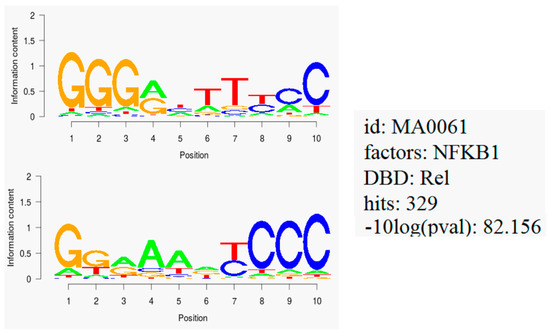 Interestingly, all 40 genes identified by COMPARE analysis (Table 2) harbored binding motifs for NF-κB. We performed motif analysis for upstream promoter sequences of 40 genes that correlated with the cytotoxic activity of scopoletin. With 329 hits, the NF-κB DNA binding motif (Rel) was observed to be significantly enriched (with a log p-value of −8.2) in regions of 25 kb upstream promoter of all genes (Figure 7), indicating that NF-κB may play a considerable role for the regulation of genes associated with cellular response to scopoletin.