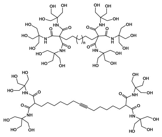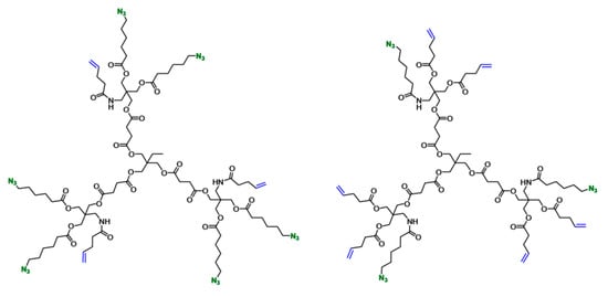 25]. They designed two sets of polyester dendritic scaffolds, the first one displaying three alkene and six azide groups and the second one with six alkene and three azide groups (