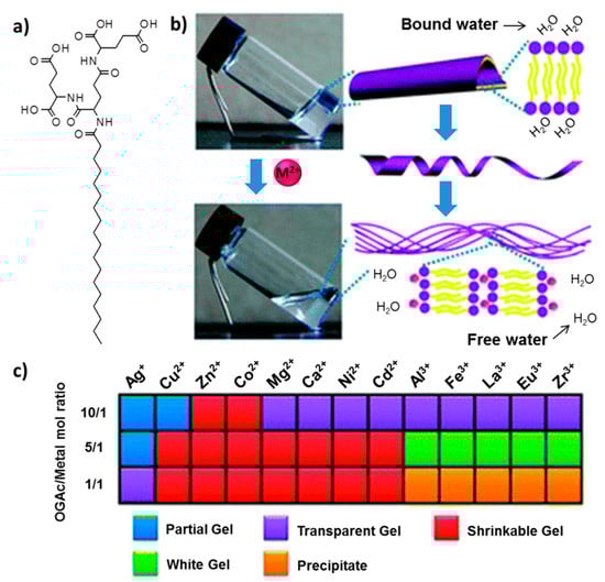 Figure 4). The critical gelation concentration (CGC) was found to be directly related to the type of metal ions and the ratio of ions. Hydrogels containing divalent metal ions exhibited continuous shrinkage. This shrinkage is a reversible phase transition, and upon heating of the shrunken gel, the phase turns into a sol, and then, the gel is reformed. The reversibly-shrinkable hydrogel was employed in controlled release of vitamin B1 (VB