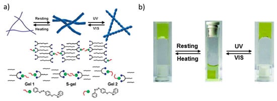 19]. Photo-responsive hydrogels undergo macroscopic volume phase transitions or shrinking/swelling due to the photoisomerization of reactive chromophores in the gel matrix. The anthracene moieties were shown to undergo photodimerization upon photoirradiation (λ > 300 nm), resulting in a gel-to-sol transition of the hydrogel. Another photo-responsive system was recently reported by Liu and co-workers by employing co-assembly of an