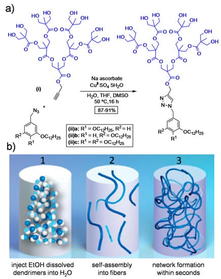 61] using dendron polymer conjugates as building blocks. Namazi and Adeli synthesized dendron-linear polymer-dendrons (DLDs) composed of linear PEG and citric acid-based polyester dendrons for thermo-reversible hydrogel formation [
