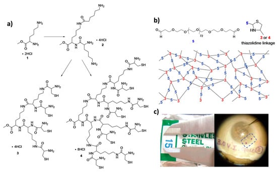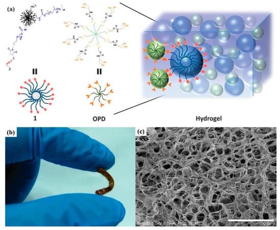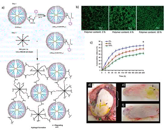 Figure 10a). They prepared hydrogels in 10–30 s by mixing equal volumes of dendrimer and PEG solutions. Fluorescence microscopy images showed that the pore size in the hydrogel network decreased, and crosslinking density increased by increasing the polymer content (