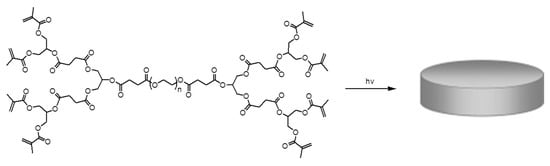 37]. They used glycerol (GL) together with one or both of the other two biocompatible compounds, succinic acid (SA) and β-alanine (BA) to obtain first-generation dendrimers divergently from PEG, followed by installing methacrylate (MA) groups at the periphery of these copolymers. Hydrogels were obtained using copolymers composed of glycerol (GL) and β-alanine (BA) ([G1]-PGLBA-MA)