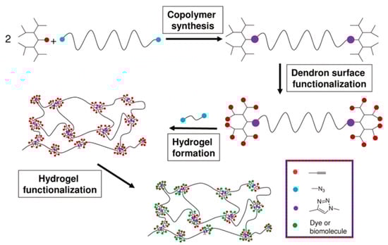 44] were obtained by coupling dendrons containing an alkyne group at their focal point with PEG diazides via the CuAAC reaction. The peripheral hydroxyl groups on the dendrons were reacted with 4-pentynoic anhydride to install alkyne functionalities at their periphery. Hydrogels were prepared by crosslinking the alkyne terminated dendron-polymer conjugate with tetra (ethylene glycol) diazide using the CuAAC reaction. Functionalizable hydrogels with a tunable degree of residual alkyne groups were obtained by varying the ratio of the alkyne to azide groups in the gel precursor formulation. Controlled crosslinking and functionalization were proven by covalent attachment of various fluorescent dyes, as well by tailored immobilization of streptavidin after controlled attachment of biotin azide onto these hydrogels.