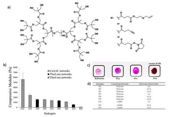 Figure 18a). Hydrogels were obtained using thiol-ene, thiol-yne, CuAAC or NHS ester coupling chemistries with complementary telechelic PEGs. In this study, tunable mechanical properties were obtained by varying the ratio between DLDs and linear PEGs (