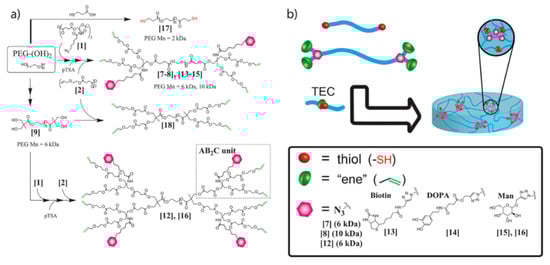 Malkoch and co-workers employed UV-initiated thiol-ene click chemistry (TEC) for the synthesis of non-toxic and degradable hydrogels using orthogonally-functionalized dendron polymer conjugates [