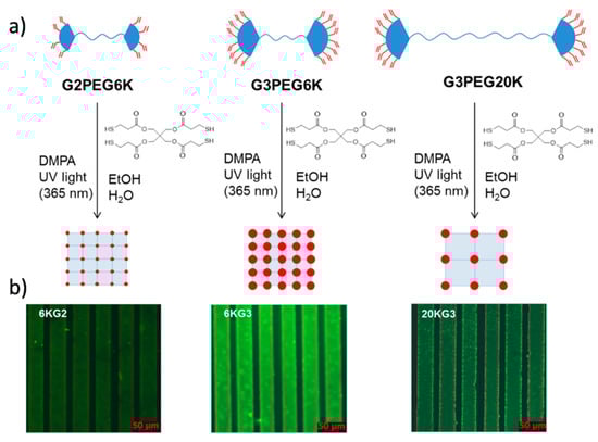 48]. The dendron-polymer conjugate was synthesized through CuAAC coupling of PEG-diazides with orthogonally-functionalizable dendrons containing an alkyne group at the focal point and alkene groups at their periphery. Hydrogels were fabricated by thiol-ene chemistry between the alkene groups on the dendron-polymer conjugates with a tetrathiol-based crosslinker, pentaerythritol tetrakis (3-mercaptopropionate) (PETMP). Clear and transparent hydrogels were obtained and further functionalized with thiol-containing dye in a sequential manner. They tuned alkene-thiol stoichiometry to obtain residual alkene groups as handles for subsequent functionalization on bulk and micropatterned hydrogels (