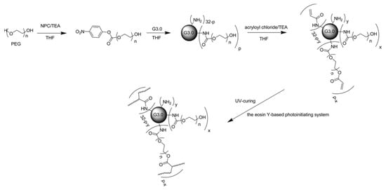 49]. They coupled the G3 PAMAM dendrimer with PEG chains of different lengths after the activation of PEG diols in the presence of 4-nitrophenyl chloroformate (NPC) and triethylamine (TEA). Photoreactive dendrimer polymer conjugates were obtained via attachment of acryloyl groups to residual amine groups of the PAMAM dendrimer and the hydroxyl group of PEG chains. An eosin-Y-based photo-initiating system was used to obtain a completely crosslinked network. In this study, they reported that the degree of PEGylation, PEG chain length and acrylate distribution determined the gelation and swelling parameters. The potential applications for tissue engineering and drug delivery were underlined due to the cyto-compatibility and structural characteristics of these hydrogels. However, in this strategy, it is not possible to obtain the selectively-acrylated distal end of the PEG chains due to the reactivity of acryloyl chloride towards free amine groups on the dendrimer periphery, during the acrylation of the PEGylated (PAMAM) dendrimer. As a result, efficient crosslinking was probably avoided due to possible shielding effect of PEG on the acrylate groups of the dendrimer surface.