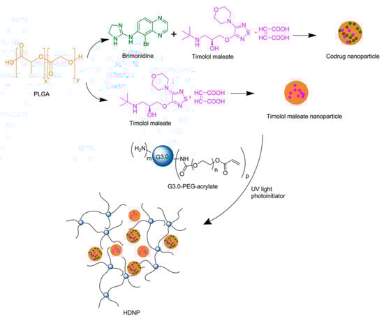 To further enhance the drug delivery system and to obtain better controlled drug release of the hydrogel dendrimer platform, Yang and co-workers formulated a hybrid dendrimer hydrogel/poly(lactic-co-glycolic acid) (PLGA) nanoparticle system with the two anti-glaucoma drugs (