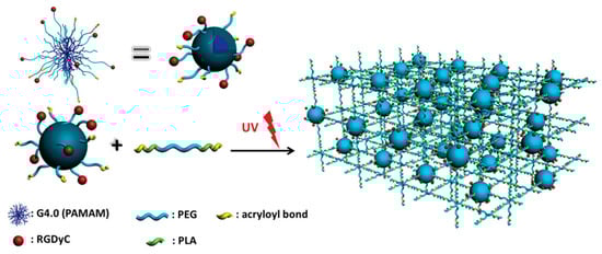 b-poly(lactic acid) (PEG-PLA-DA) triblock copolymer and a PAMAM dendrimer containing PEGs with acryloyl terminal groups. A G4 PAMAM dendrimer was modified to install acryloyl-terminated PEG segments and arginine-glycine-(aspartic acid)-(