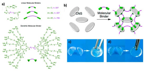 Although these dendritic molecular binders have various advantages to prepare aqueous networks, because of the multi-step synthesis of these dendritic binders, practical challenges are present for applications that require a large scale. Aida and co-workers designed linear polymeric binders to overcome this drawback and compared their physical properties to the dendritic ones (
