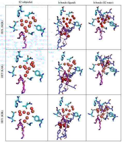 The three investigated ligands were chosen from the available ones due to their structural similarity but significantly differing ΔGbind,exp. The ligands, plus the residues lining the S2 subpocket which accommodates the X residue of KXK, are depicted in Figure 1. A superposition of the three crystal structures used in this study, including a closer look on the conserved water molecules in the S2 subpocket, can be found in Figure S1 in the Supplementary Materials.