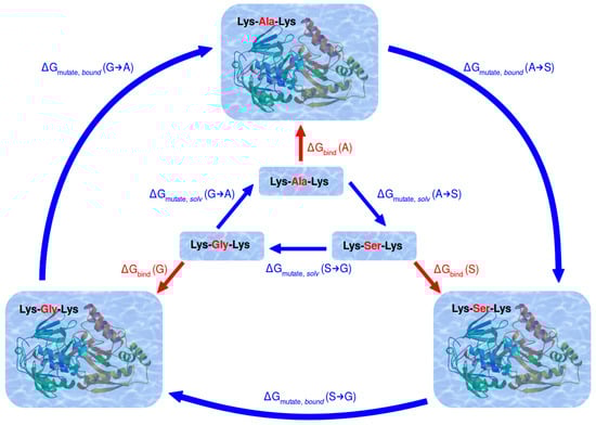 0 = ΔGmutate,solv (A → S) + ΔGbind (S) − ΔGmutate,bound (A → S) − ΔGbind (A)