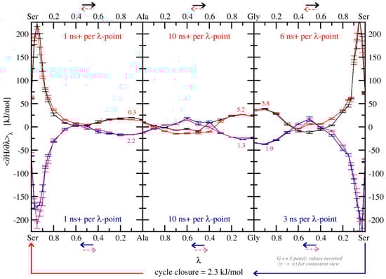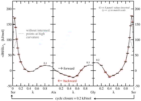 Final thermodynamic cycle in H2O, at 10 ns simulation time per λ-point for all TI curves. Solid black lines are forward transformations (read from left to right), solid red lines are backward transformations (read from right to left; shown with inverted sign and direction for better comparability to the forward process). Dashed lines are provided to highlight the necessity of additional λ-values at areas of high curvature. Note that for the G ↔ S transformations the negative value of ⟨∂H/∂λ⟩λ is plotted to match the scale. Numbers directly above and below the lines refer to the hysteresis between associated forward and backward transformations in in kJ·mol−1.