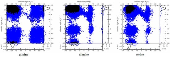 Figure 4 shows that conformational sampling of all ligands in the bound state is tightly restricted in comparison to the free state. This loss of conformational freedom and the associated reduction in conformational entropy is largest for KGK and explains its weak binding affinity [14,15,18]. Some methods regard conformational entropy loss as constant for all tripeptide ligands of the KXK series [16]. However, from Figure 4 it seems unlikely that the cause of the observed hysteresis in KGK transformations would be the flexibility of the glycine residue. It is probably rather another characteristic of the KGK crystal structure: abundance of water in the binding site.