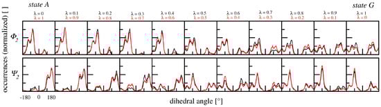 Dihedral angle distribution for KAK → KGK along forward (black) and backward (red) transformations in solvent. ϕ2/ψ2 angles are monitored over a 10 ns simulation trajectory at each λ-point. Forward and backward transformations are in agreement for both angles. Additionally, distributions show clear peaks for the side chain bearing state A, and wider fluctuations for state G which lacks a side chain.