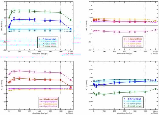 An analysis of the differences in free energy as a function of simulation time, split up into peptide-peptide, peptide-protein, and peptide-solvent contributions, has also been performed for all other transformations.