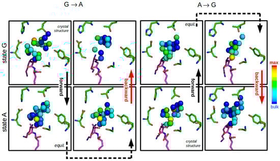 Changes in solvation of the S2 binding pocket are visualized in Figure 8, which monitors water molecules in the active site during end point simulations of the transformation processes between KGK and KAK. The occurrence of water molecules was measured on a grid with a spacing of 0.2 nm, and each water molecule was assigned to its nearest grid point. In the forward transformation process KGKcrystal → KAK, the emerging alanine side chain indeed seems to restrict the space available to the water molecules, resulting in a specific pattern of lowered water occurrence. However, in the backward process, the number of occurrences per grid point is clearly not being restored to its original amount. Comparing KGKcrystal to KGKfinal, it can be seen that the water molecules do not refill the gap between glycine and the protein after the backward transformation is completed. Their diffusion is simply too slow for the effective transformation time.
