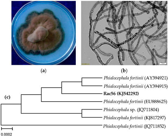 The colony diameter of Rac56 was 45 mm after inoculation in the PDA medium at 25 ± 2 °C for 20 days, with gray-black color, central uplift, neat edge, no visible secretion in medium, and a black melanized outer edge. The mycelia were dense, appeared floss-shaped, and had no evident substrate mycelium (Figure 2a). Under a microscope, the hypha was dark colored and had transverse septa, which belong to dark septate endophytes (DSE), had a diameter range of 1.5–4.5 µm, abundant globular particle contents in hypha with terminal expansion, and did not produce conidium (Figure 2b). The identification was authenticated by ITS analyses. The rDNA sequence of Rac56 (KJ542292, 519 bp) and its closest related species available at GenBank were selected for construction of NJ phylogenetic tree using MEGA 4.0 program after sequence alignment with Clustal W. The endophytic fungus Rac56 was found to be closely related to Phialocephala fortinii (AY394915 and AY394921) (Figure 2c) with 99% homology. The morphological characteristic described above corresponded to anamorphic P. fortinii [16,17,18,19,20], which led to its designation as P. fortinii.
