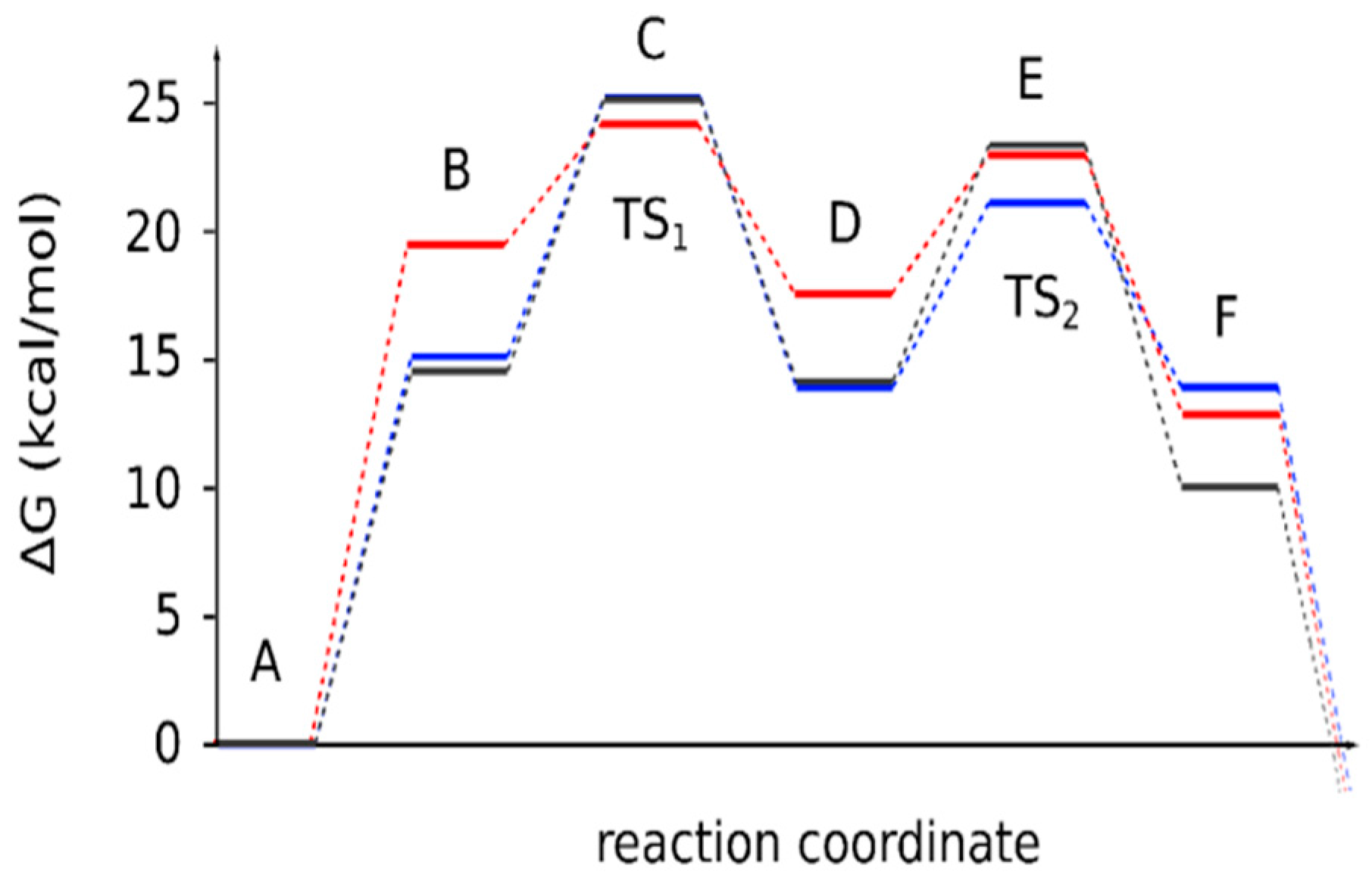 Figure 1. Free energy profiles for the Cope rearrangement reactions of compounds 4a, 4b and 4c. The letters designate the reaction intermediate and transition states as displayed in Figure 2. The final deprotonation step is indicated by the last dashed lines. Color code: dark grey line—4a; blue—4b; red—4c.