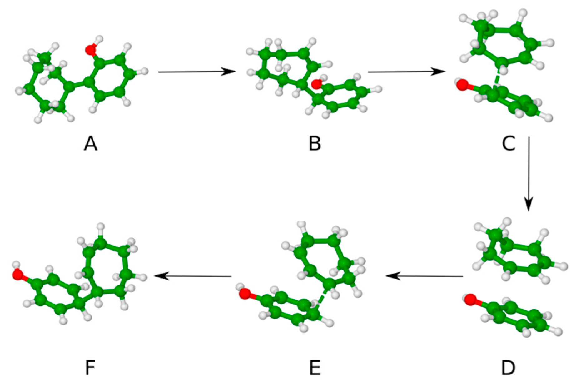 Figure 2. The mechanism of the proton-catalyzed Cope rearrangement. (A): the most stable protonated form; (B): suitable tautomeric form for Cope rearrangement; (C): first transition state (TS1); (D): intermediate structure; (E): second transition state (TS2); (F): protonated product state. Color code: green—carbon; red—oxygen; white—hydrogen.
